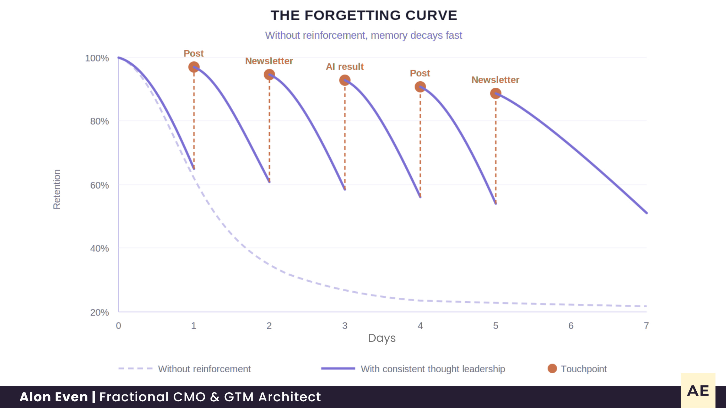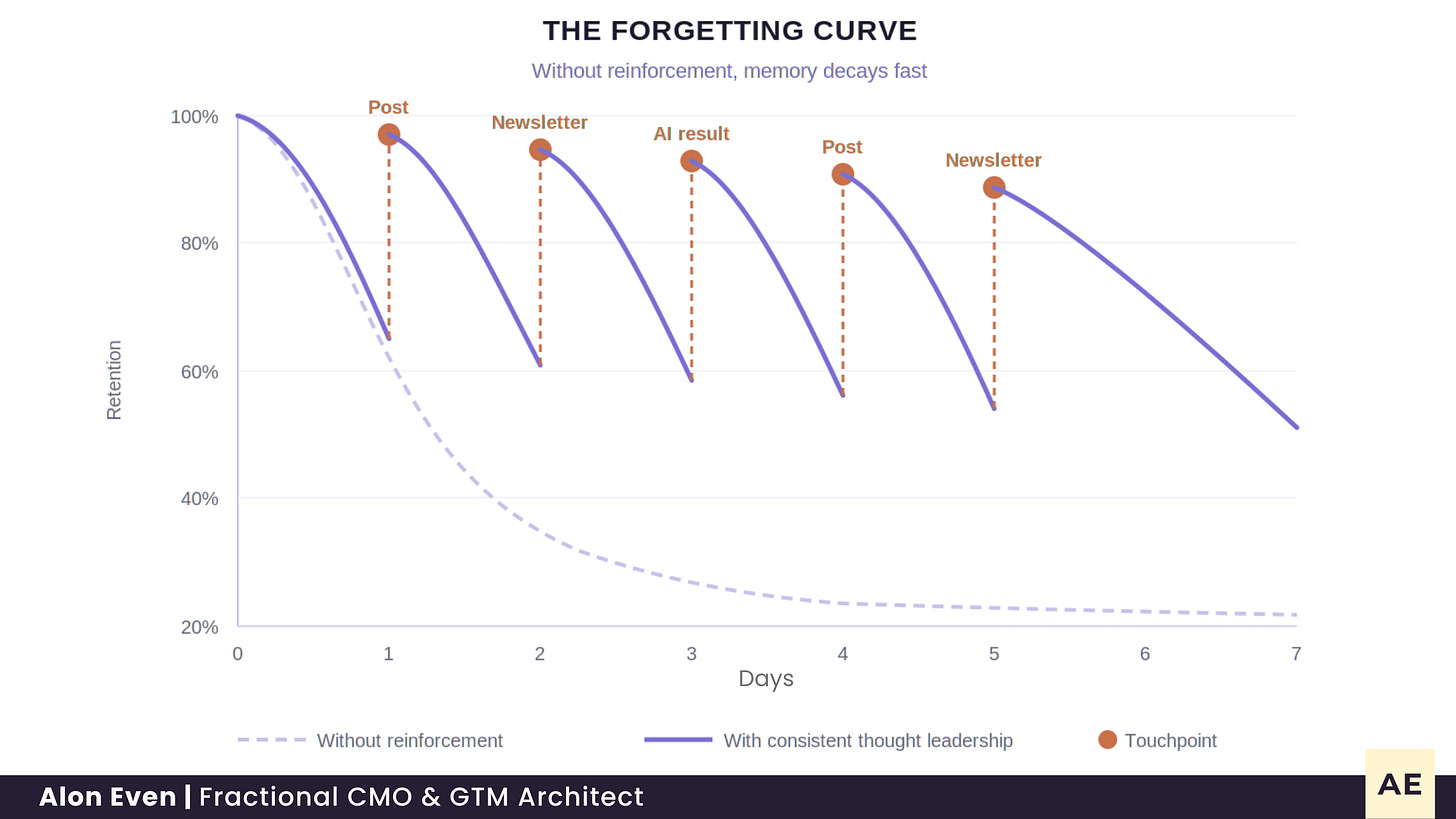 The forgetting curve, mapped by Ebbinghaus over a century ago, shows how fast memory decays without repetition. And today, there’s far more competing for that memory as AI floods the market with more sameness.