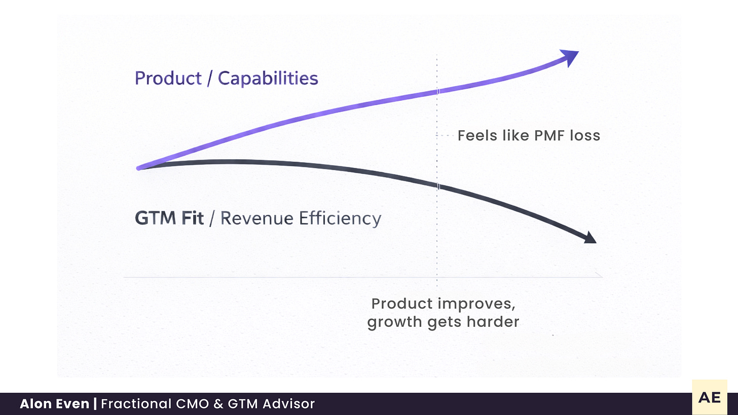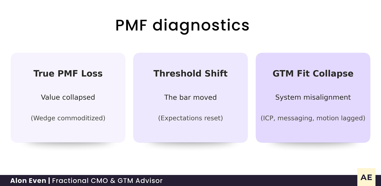 And yes, it feels like PMF collapse. But in most cases it’s misalignment: GTM stayed static while the market kept moving.